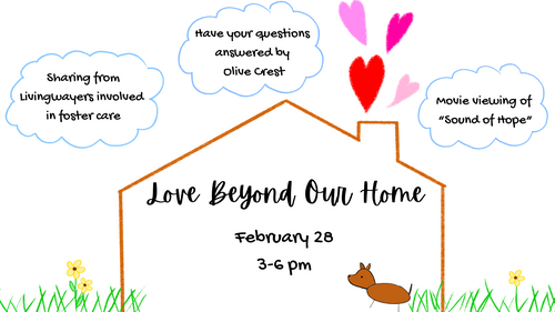 Join us at church on Saturday, February 28 from 3-6pm for Love Beyond Our Home -- a night to learn how to say yes to different needs in foster care. We will be showing a movie, Sound of Hope, the true story of how a small church in east Texas mobilized to adopt 77 children. Afterwards, hear directly from LivingWay families who are involved with foster care through a live panel facilitated by Olive Crest. Deadline to Register: 2/22