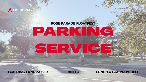Every year the floats from the Rose Parade are on display across the street at Victory park. This year we will be opening up our parking lot to Floatfest attendees on January 1-3 as part of a way to raise funds for the building and we need people to help serve.